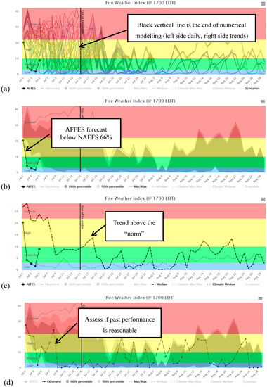 In addition to the burn probability maps, decision-makers wanted to be able to assess the individual weather, FWI System, and FBP System values that feed the burn probability model. They also wanted to use the forecasts to inform other decision-making (e.g., occurrence, control challenges, detection needs, and resource alerts). A webtool shows a chart for each weather value, FWI System value, and FBP System rate of spread for selected fuel types. Showing the individual scenarios is ineffective (Figure 8a), so the charts illustrate the probabilistic forecasts as medians, maxima, minima, and quantile bands: a middle 66% band and upper and lower 12% bands (Figure 8b). This shows the probability distribution of the forecast as prediction intervals that facilitate simple descriptions, e.g., 2/3 of the likelihood is between X and Y (the 66% band limits). Care must be taken to ensure that the users know that the median is not a single scenario (Figure 8c). The charts also show the maxima, minima, and median of all historical data, which highlights the deviation between the forecast and historical weather (Figure 8c). We colour the plot area backgrounds according to FWI System classification schemes (low to extreme) and FBP spread rates by class, e.g., low <5 m/min, extreme >20 m/min.