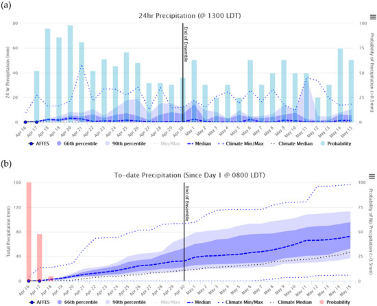 Precipitation is of special importance to decision-makers because it is the primary weather factor that that will provide relief to firefighting efforts. We plotted the probability of precipitation and to-date probability of no precipitation (Figure 9). The probability of precipitation is the percentage of forecast scenarios each day that have 24-h precipitation >0.5 mm (the threshold amount that affects the FWI System’s Fine Fuel Moisture Code) (Figure 9a). The to-date probability of no precipitation is the percentage of forecast scenarios that have had no precipitation >0.5 mm from 08:00 up to 13:00 on each day being forecasted (Figure 9b).