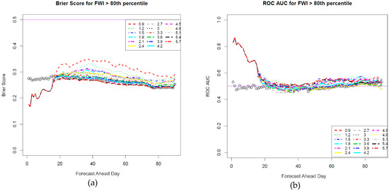 To use both the Brier Score and ROC AUC, the high-dimension forecast must necessarily be simplified to a single, discrete event that is being predicted [47], e.g., “FWI > 8”. A problem with using a constant threshold like FWI > 8 for the discrete event is that weather and typical fuel dryness changes significantly over the course of a season. We therefore used a variable threshold, e.g., “FWI > Xth percentile of historical FWI for that calendar day”. We chose to use the 80th percentile rather than the average or median because of the importance of the more extreme conditions. Choosing too high a percentile would be problematic, however, because the events would be very rare and inadequate for the Brier Score [45].