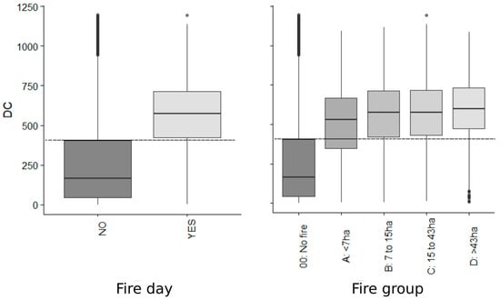 As compared to the other indexes of the fire weather index related to fuel moisture (Figure A5), DC performed better as it significantly discriminated days with and without fires (Figure 2). Fire days from the Prométhée database showed median and mean DC values that were ca. 300 units higher (572 and 548, respectively) than DC values recorded during days for which there were no fires reported (166 and 250, respectively). Moreover, the larger the fire, the higher DC (Figure 2). In order to exclude most of the no-fire-days without excluding too many fire-days, we conservatively defined the DC value of 405 units (75% no-fire-days were excluded, while 78% of fire-days were conserved) as the threshold above which days were considered as potential fire-days and also considered as belonging to the fire-season.
