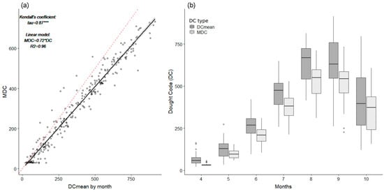 (a) Correlation between the Monthly Drought Code (MDC) and DCmean using monthly values from April to October over the 1979–2016 period (n = 532 corresponding to seven months each year for 38 years). The dotted red curve represents the perfect match between DCmean and MDC, while the black curve is the linear regression model found (MDC = aDC+b), and for which the normal distribution and homoscedasticity of residuals were tested.;(b) DCmean and the MDC changes along the fire-season (currently encompassing months from April to October).