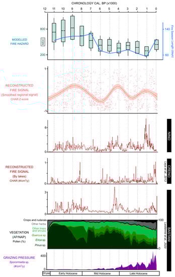 The period starting at 7 ka BP highlighted a simultaneous strong decrease in charcoal peaks (in particular for both Bastani and Creno) and a sharp change in vegetation composition, with the decrease in Pinus sp. and Erica sp. and the increase in Quercus sp. [40,74]. Such vegetation change was simultaneous to a strong decrease in the MDC values and the shortening of the fire-season length, likely due to wetter spring conditions (Figure A3). Such a wetter climate after 7 ka BP has been reported in several studies [9,40,76], but our results, combined with a high-resolution vegetation record, permitted highlighting the rapidity of this change and its targeted season, and so, to attribute this major event to a climatic cause. The stability of charcoal signal, MDC, and fire-season length until 5 ka BP showed that the ecosystem reached a new equilibrium more adapted to these wetter climate conditions.