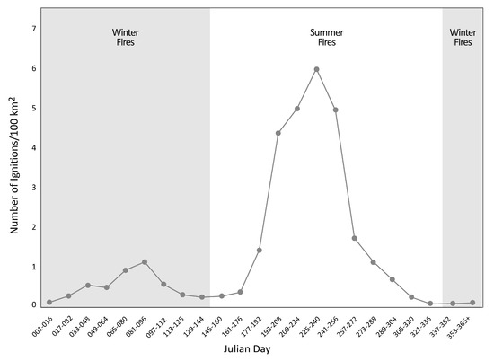- Bajocco, S.; Koutsias, N.; Ricotta, C. Linking fire ignitions hotspots and fuel phenology: The importance of being seasonal. Ecol. Indic. 2017, 82, 433–440. [Google Scholar] [CrossRef]