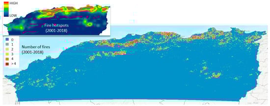 Maps of fire occurrence in Northern Algeria (number of fires, 2001–2019). The enclosed Figure (upper left) indicates the fire hotspots and their level of density.
