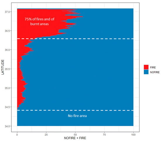 Percentage of pixels burnt (‘fire’) and unburnt (‘nofire’) according to the latitude in Northern Algeria. The northern area (latitude > 36.3° N) regroups 75% of all fires and of the areas burnt from 2001 to 2019. The southern ‘no fire area’ (latitude < 34.4° N) indicates the southernmost limit of fires from 2001 to 2019.