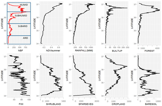 Latitudinal distribution of fires and of fire drivers in Northern Algeria (latitude ranging from 34° N to 37.5° N). NBF is for the fire frequency (number of fires); NDVI summer is the NDVI value for each pixel from June to October; RAINFALL is the mean annual rainfall amount (mm); BUILT-UP is the built-up index which sums up the population density, the housing density, and the density of human infrastructures promoting ignitions; FOREST is the coverage by forests; FWI is the mean fire weather index during summer; SHRUBLAND is the coverage by shrublands; SPARSEVEG is the coverage by sparse vegetation (steppic); CROPLAND is the coverage by croplands and agropastoral lands; BARESOIL is the coverage by bare soils and rock outcrops. For all land cover types, the values are the number of pixels. The mean latitudinal limits of the four bioclimates are indicated on the upper left panel (NBF).