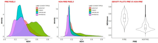 Density distribution of summer NDVI indices for the pixels burnt from 2001 to 2019 (“FIRE PIXELS”) and the unburnt pixels (“NON-FIRE PIXELS”) in Northern Algeria according to the main land cover types. The right panel compares the NDVI distribution of fire versus no-fire pixels (Tukey HSD test; p < 0.0001). The mean value is the central bar. AGROPAST are agricultural and pastoral fuel types; FOREST corresponds to all forest types; SHRUBLAND corresponds to shrublands; SPARSEVEG is for sparse and low-stature vegetation types (herbaceous steppic).