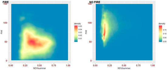 Figure 5 jointly displays the density distribution of NDVIsummer and of FWI (i.e., the fire danger index) for fire and no-fire pixels. It clearly shows that fire pixels span over a moderate-to-high range of both summer NDVI and of FWI, whereas no-fire pixels are concentrated at high FWI values but are restricted to very low summer NDVI values.