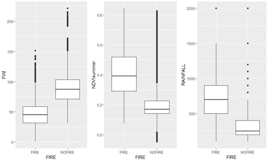 The boxplots (Figure 6) indicate that NDVIsummer and the total annual rainfall are much higher for no-fire pixels, whereas the FWI is much lower.