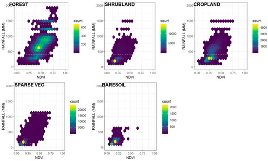 Distribution density of mean annual rainfall (mm) and mean annual normalized difference vegetation index (NDVI) across the main land cover types in Northern Algeria (2001–2019). FOREST is the coverage by forests; SHRUBLAND is the coverage by shrublands; CROPLAND is the coverage by croplands and agropastoral lands; SPARSEVEG is the coverage by sparse vegetation (herbaceous steppic); BARESOIL is the coverage by bare soils and rock outcrops.