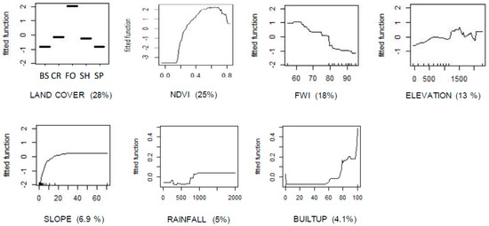 The BRT model (Figure 11) showed that fire was mainly present in forests, shrublands and croplands, in areas with high fuel biomass (NDVI > 0.35), relatively low fire danger (mean annual FWI < 75), high rainfall (>1000 mm.yr−1) on remote terrain with slopes higher than 10°, and elevation higher than 500 m. This mainly corresponds to mountain landscapes of the northernmost part of Algeria, in contrast with the sub-arid–arid flat areas of the south. The built-up index had low effect in this model, but it clearly shows that high density of built-up features promotes fire (Figure 11).