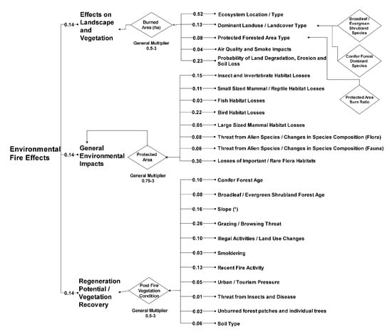 | Ecosystem location/type | 7.34 | Mountainous and wildland urban interface ranked highest | Dominant type of the affected landscape | [22,24,25,26,27,28,29,30] |
