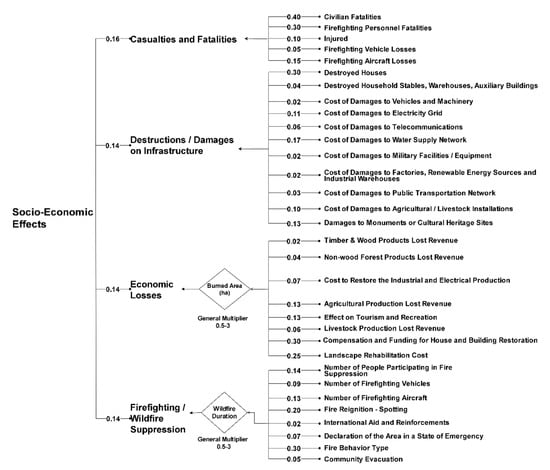 | Timber and wood products lost revenue | 0.26 | The higher the losses the higher the weight | Broad landscape categories | [5,207,216,217] |