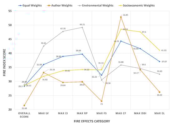 | Fire Effects Category | Grouping | Equal Weights | Author Weights | Environmental Weights | Socioeconomic Weights |