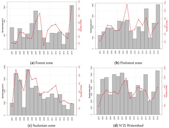 Annual series of the total annual burned area (SB) and number of wildfires (NF) in the (a) forest zone, (b) preforest zone, (c) Sudanian zone, and (d) the whole N’Zi River Watershed.