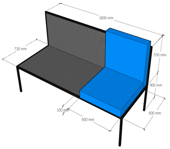 In this study, a field survey conducted on 31 multiplexes determined that the combustible material in karaoke bars and room salons mainly consisted of sofas, tables, monitors, sound systems, and air conditioners. A previous study performed a furniture calorimeter test by selecting furniture as the representative combustible material in residential facilities [21], classifying it according to the fire growth rates (α) presented in the NFPA 72 (the National Fire Alarm and Signaling Code 2007, Annex B); sofas and drawers corresponded to “Fast” fire growth rates; chairs and tables corresponded to “Medium”; while home appliances, including televisions, corresponded to “Slow” rates. Therefore, in this study, sofas (with the highest fire growth rates) were selected as the standard combustible material in multiplexes. A sofa model was designed by referring to that used in fire tests conducted by Bwalya et al. [22] and Su et al. [7].