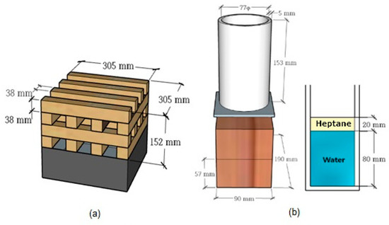 A fuel package, which is the ignition source to be used in fire tests to verify the fire control performance of simple sprinkler systems in multiplexes, was designed in the form of a sofa that corresponds to the fire size calculated in Section 2.1. According to ISO 6182-10, the fuel package in residential spaces fires uses a combination of wood crib and simulated furniture (Figure 1a,b). A three-person sofa was selected as the augmented combustible material for fires in multiplexes (Figure 1c). The sofa model was fabricated using six sheets of Polyurethane Foam (PUF) measuring 600 mm (W) × 600 mm (L) × 100 mm (D) [1EA] by referring to previous studies (Figure 2). Wood crib and a heptane can were used to ignite the combustibles (Figure 3). The specifications of each combustible material for constructing the fuel packages are as follows: