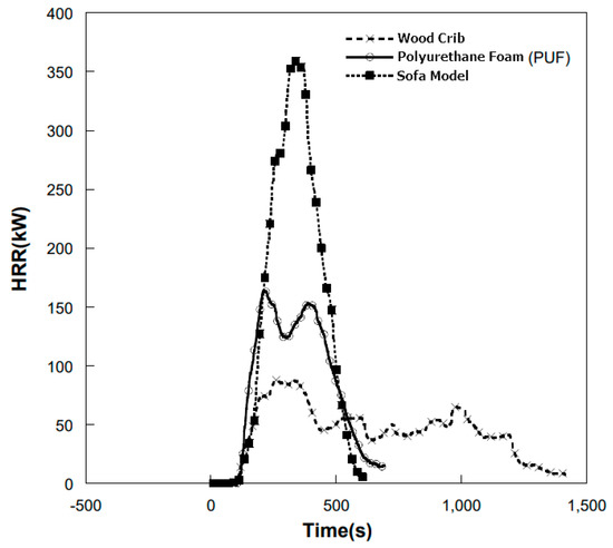 A cone calorimeter (ISO 5660) was used to measure the HRRPUA of the combustibles used for fire testing. We measured the HRRPUA of the PUF and wood cribs used in sofa models, as shown in Figure 4. The HRRPUA of the PUF used in the sofa model was 559.75 kW/. This is relatively consistent with the HRRPUA of over 550 kW/ as specified in Section 2.1.