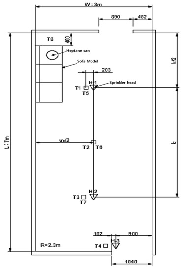 The fire room of the standard ISO 6182-10 was used as the fire test room for the fire tests of simple sprinkler systems in multiplexes. The fuel package selected in Section 2.2 was used to reproduce the fire environment of multiplexes. According to the standard, the fire test room size was determined by the protection area of simple sprinkler systems. The standard number of simple sprinkler systems is two; hence, the fire test room size was determined to be the protection area occupied by two simple sprinkler systems (i.e., the protection width × double protection length). According to the National Fire Safety Code (NFSC), the radial distance of a simple sprinkler is 2.3 m. Thus, the actual protection width and length were 3 and 3.5 m, respectively. The fire test room size was 3 m (W) × 7 m (L). The ceiling height of 3 m, which was found to be the maximum height among the multiplexes surveyed, was applied to simulate a condition stricter than that of houses. Figure 6 shows the floor plan of the fire test room.