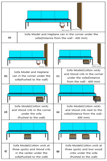 - The same ignition method as (a) is applied, but the sofa is pushed up against the wall, to consider the case of using one sofa to simulate a condition favorable for fire growth.