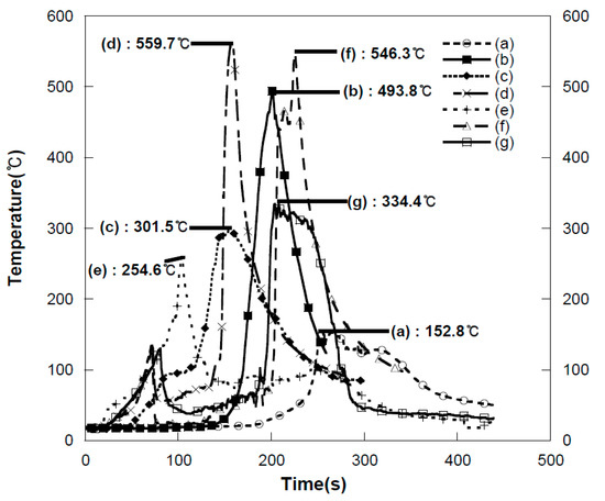 In the cases of (a), (c), and (e), in which the sofa model was not in close contact with the wall, the maximum temperatures of the fire room reached 152.8 °C, 301.5 °C, and 254.6 °C, respectively. In condition (c), the ignition source was located under the sofa model, and the maximum temperature in the fire room was relatively higher than that in condition (a) where the heptane can was used as the ignition source.