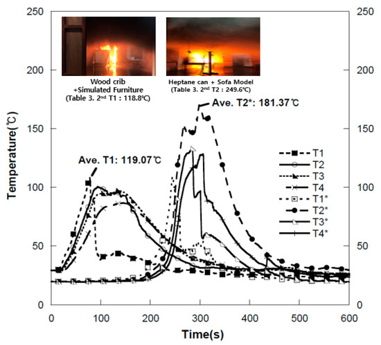 First, the fuel package for the multiplexes that used the sofa model exhibited average ceiling heat air current temperatures that were measured using the three fire tests were up to 77 °C higher, compared with the fuel package for the residential space that used the simulated furniture at the same position (Figure 10). In the case of the sofa model fire, the heat air current temperature around the ceiling continuously increased even during sprinkler operation, indicating that the fire growth continued while the water was being discharged. However, in the case of the simulated furniture, the fire was easily controlled because the heat air current temperature was immediately reduced by sprinkler operation. This result clearly shows that the new fuel package has a higher fire growth rate. Meanwhile, the operation time of the sprinklers was different in the two fire tests because the simulated furniture exhibited fire growth immediately after its direct ignition with the cotton wick, but the sofa model showed fire growth after the fire was slowly spread by the heptane can under the sofa.