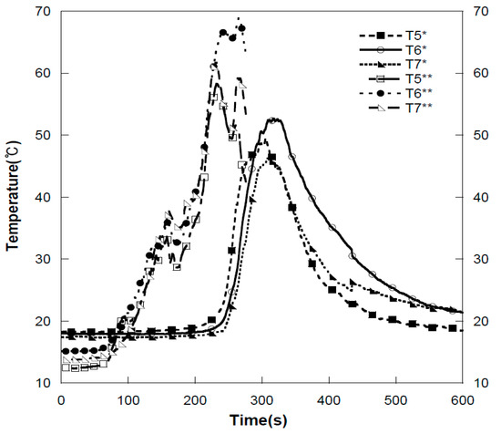 In this section, the fire test results of the fuel package for houses were compared with those of the fuel package for the multiplexes for the commercial simple sprinkler systems used in Section 3.1 to examine the suitability of the newly developed fuel package. For each fuel package, the fire tests were repeated three times, and the heat air current temperature was measured, with the results shown in Figure 10 and Figure 11.