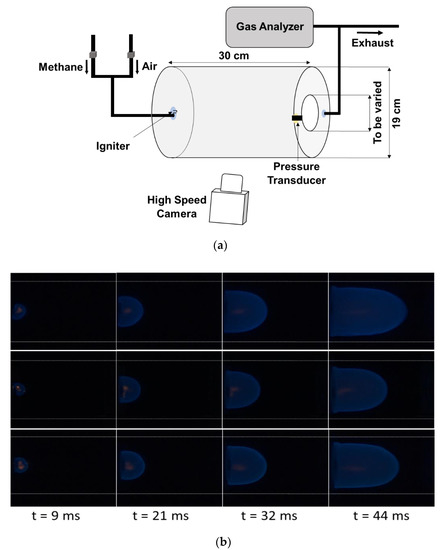Experiments for vented methane-air explosions with rear ignition (RI) [22]: A sketch of the experimental setup (a) and consecutive photos for the evolution of stoichiometric () methane-air, elliptic-like flames inside a cylinder with vent areas: 67.9 cm2 (top), 88.6 cm2 (middle), and 132.7 cm2 (bottom) (b).