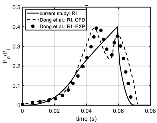 In the past, Dong et al. [19] reported a combined experimental and computational investigation of vented explosions of a hydrogen-air mixture in a cylinder of length 100 cm and diameter 18 cm. Consequently, we started the present work with employing the EVA to predict the pressure of hydrogen-air explosions in such a cylindrical enclosure. The initial conditions were taken as atm and . Figure 3 compares the EVA results with the experimental data and the CFD modelling of [19]. Specifically, time evolution of the scaled pressure, , in the case of rear ignition (RI) is depicted in Figure 3, with good agreement between the EVA and Ref. [19] seen.