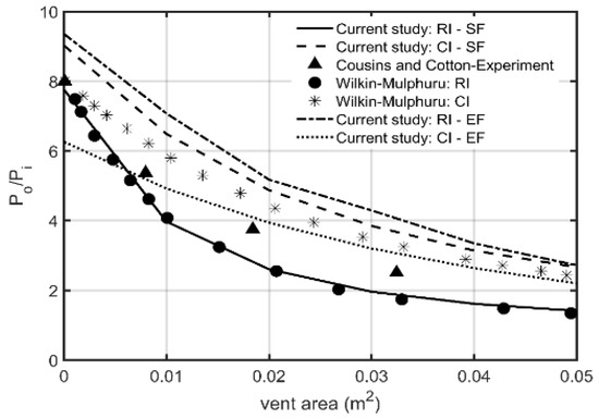 In addition, we have tested how the flame shape and the ignition location influence the accuracy of the EVA predictions. This is shown in Figure 4, where the maximum peak pressures are presented versus the vent area, with two options for the flame morphology—the spherical flame (SF) shape and the ellipsoidal flame (EF) shape—considered for both central ignition (CI) and rear ignition (RI). Here, the EVA results are compared with the experimental data, shown by the markers in this figure. Again, we see good agreement between the EVA and the experiments in Figure 4. More details about these simulations can be found in Ref. [21].