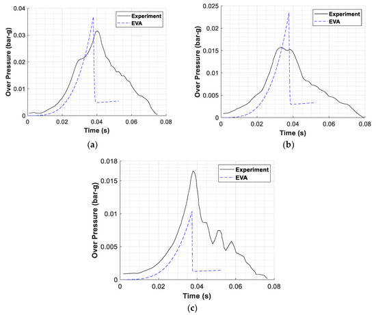 Finally, when the vent area has been further increased, to 132.7 cm2 (the large vent case, Figure 5c), the EVA pressure history and timing generally match the experimental results before attaining the peak pressure. Quantitatively, the EVA predicted the overpressure of 0.010 bar-g in this case, while the experimental value was 0.016 bar-g.