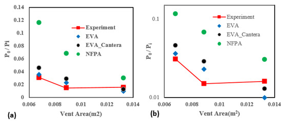 The peak pressures versus the vent area in the normal (a) and semi-logarithmic (b) scales: Validation of the EVA without (blue diamonds) and with (black circles) Cantera by the experiments [22] (red squares). The green squares show the results calculated through the NFPA 68 standards [32].