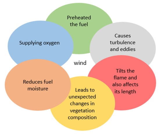 Wind can change in strength and direction throughout the day. This change might be very abrupt. In the case of planned burns, this can cause a controlled fire to suddenly become uncontrolled without adequate alert mechanisms. The fanning effect increases the source of oxygen, leading to more intense fires. Wind also reduces the humidity of the surface fuel, resulting in drier fuel beds and further increasing the flame intensity. The resulting air pressure will force firebrands, sparks and flames to move and reach a new source of fuel in the surrounding environment. By moving the flames closer to a new fuel bed, the wind causes faster preheating of the fuel due to increased radiant thermal energy. Much of the fuel is accessible for combustion, as it is drier and therefore can obtain ignition temperatures much faster. The fire increases radiation in some conditions leading to burning embers and firebrands. One of the well-studied mechanisms by which forest wind–fire disturbances interact is that wind damage increases the amount of flammable fuels—intensifying the fire—resulting in unanticipated changes in vegetation composition. Nonetheless, wind disturbance might buffer the impacts of fire by mechanisms such as discrete fuel beds [15,21].