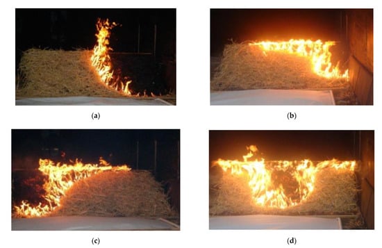 In these tests, the slope angles β and α were 20° and 35°, and the tests were conducted in the presence of a 4 m s−1 (~15 km h−1) wind. The resulting fire extension across the slope was different in the presence of the 4 m s−1 wind in comparison to the no wind instances. Figure 3a,b show the difference in lateral extension features for the no-wind and wind cases. Figure 3c,d illustrate that analogous unusual extension happened as the ignition was made on the centre and the left side of the slope. Based on this observation, central ignition resulted in fast lateral extension occurring in both directions along the slope top.