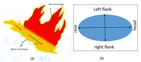 (a) A flank fire produced by alteration in the direction of wind. (b) Different sides of the fire in terms of head, rear and flank.