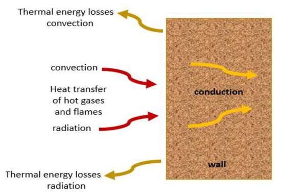 Fires can extend to structures and buildings through openings. The simplified procedure of heat transfer within the heating up time of a substance is shown in Figure 5. Thermal energy is transmitted from the attacking fire to the substance surface by convection and radiation. At the same time, there are thermal energy losses from the surface by convection and radiation to the environment and thermal energy is also diffused throughout the substance. If the total thermal energy transfer from the fire is high enough, the substance surface temperature will be increased to the ignition range [44].