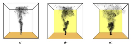 Smoke distribution in cross-wind direction for different wind speed [83] ((a) v = 0, (b) v = 1 (m/s), (c) v = 2.5 (m/s)).
