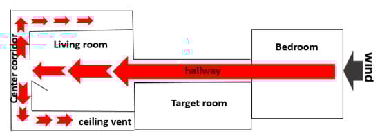 The tests were designed to expose a public corridor region to a wind-driven fire and post-flashover apartment fire. For each of the tests, the door from the building to the corridor was kept open and the fire was ignited in the building’s bedroom (Figure 9). The heat of the fire travelled along the hallway towards the end of the building. Before venting or failure of the bedroom window, the rate of thermal energy release from the fire was about 1 MW. Remotely, the trash enclosure was ignited, and the fire grew [84,89].