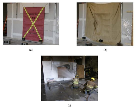 A summary of the conducted tests is presented in Table 1. First, the fire tests in the building were different from the other tests because there was not any external wind acting on the building. The second test was conducted to analyse the effect of wind on the building fire and to quantify the effect of large wind control mechanisms (Figure 10a,b). The other tests were carried out to investigate the effect of wind on the fire, quantify the effect of small wind-control devices (WCD) and finally quantify the effect of a small water spray (about 1.9 Lit/s) into the window (Figure 10c).