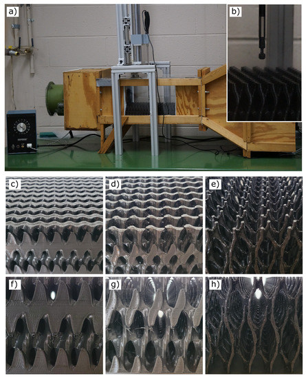(a) Wind tunnel setup and (b) a close up view of the test section and the sensor. (c–h) The 3D-printed models observed from the top (the top row) and side (the bottom row). (c,f) At 50% porosity; (d,g) 80% porosity; (e,h) 95% porosity.