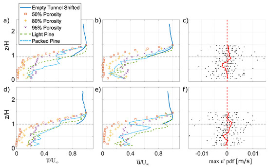 Mean streamwise velocity measured within the test section of the wind tunnel at (a) 17.5 and (b) 31 cm from the leftmost position (see in Figure 2a). The mean wind profile in the empty wind tunnel (solid blue line) is shifted upward by the thickness of the fuel models (0.075 m). (c) Streamwise velocity fluctuations () corresponding to the maximum probability density function (PDF) of at each height from all measurements within the fuel layer (black dots); the red line indicates the mean values of the PDF of at each height. The background maximum velocity in the empty wind tunnel is m/s. (d–f) are the same as in (a–c) but for m/s.
