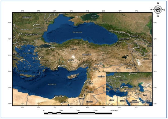 Turkey is located in the northern hemisphere in a place connecting the continents of Europe and Asia. The geographic location is between the 36° and 42° north parallels and the 26° and 45° east meridians. Turkey, which has a total surface area of 783,562 km2, is surrounded by the Mediterranean Sea, the Aegean Sea, and the Black Sea (Figure 1).