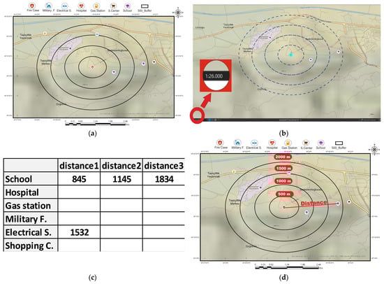 (a) Buffer map for fire case 1. (b) Map scale at distance measurement. (c) Measured distances of the risk criteria. (d) Measurement of distances.