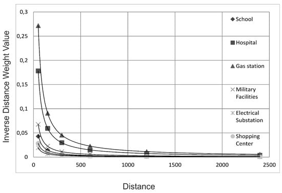 where zi represents the weight at point i—that is, the weight value (w) of a school or hospital; the distance; and wp the effect at distance di. In preliminary studies, since the method was shown to be sufficient for the discrimination of the effect of distance, the calculation was carried out accepting that n = 1. The weighted values found by the IDW method are given in Table 4. The weights of the criteria, of which the priorities were assessed by AHP, were determined again according to the distance to the location of the fire. The IDW model was generated in a distance scale at the locations of fires according to the IDW weights. According to the trends of the graphics of the model, the distances of structures and facilities, determined as criteria around fire places, were obtained. The plot in Figure 5 shows their decreasing trends effect with the increasing distance of the criteria. The risk scores obtained using this approach of calculating the weights of the distance to the location of a fire are presented in Table 5.