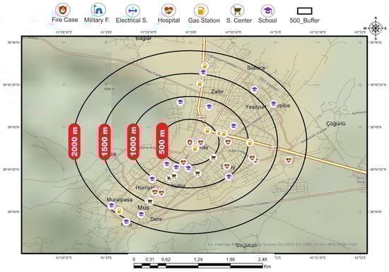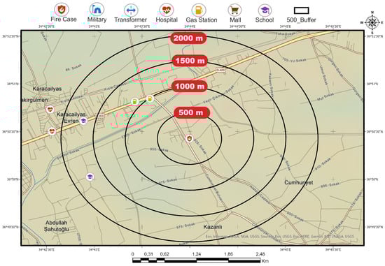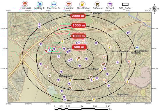 Beside the position of each fire case (Figure 2), the positions of schools, gas stations, and other places selected as criteria were marked on a map. Latitude-longitude data of such places were generated with the use of open-access interactive mapping services such as Google Maps, Yandex Map, Wikimapia, OpenStreetMap, Google Earth Pro, ArcGIS Pro, and Esri Map. Buffer maps were generated for schools, hospitals, and gas stations for each fire case with the use of GIS methods (see in Supplementary Materials). Then, the number of places related to the six criteria and their distance to the fire location were determined with Google Earth Pro at the 1/26.000 scale. (Figure 4).