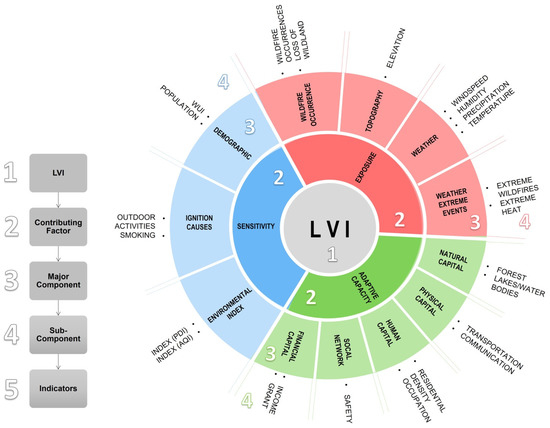 Description of the framework developed for the LVI (box 1 and the central gray circle). LVI is represented by contributing factor (box 2). The contributing factors are sensitivity (blue), exposure (red), and adaptive capacity (green). The contributing factors are further divided into major components (box 3). The major components are color-coordinated with the contributing factors. The major components for sensitivity (blue) are demographic, ignition causes, and environmental index (light blue); for exposure (red) are wildfire occurrence, topography, weather, weather extreme events (light red); for adaptive capacity (green) are social network, natural, physical, human, and financial capital (light green). Major components are divided into sub-components (box 4) and represented by the sub-components in the outermost part of the circle. The sub-components are further divided into indicators (box 5) and not shown in this figure. Refer to Table A2 for each indicator variable.