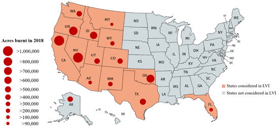 The LVI analysis is conducted solely for 14 fire prone American states that are most at risk to wildfires. The states selected are Arizona, California, Florida, Idaho, Montana, Nevada, New Mexico, Oklahoma, Oregon, Utah, Washington, and Wyoming because they experienced the highest risk of wildfires in 2018, as determined from by the maximum acres burnt in 2018 and 2019 and as documented in the NIFC 2019 Wildfire Risk Report (Table A3 in the Appendix A). The 14 states analyzed in this study had the largest acreage burnt in 2018 across the US (Figure 2). For these reasons, we limit our analysis to comparing the LVI for only the top states most exposed to wildfires. The remainder of the states are not as exposed and will inevitably provide irrelevant comparisons. Though Alaska was included as a top state listed in the 2019 Wildfire Risk Report, it was excluded from our study due to the lack of spatial and temporal comprehensive data, such as those required under sensitivity (e.g., number of houses within the WUI zone), and if included, would have impeded our comparison analysis among the other states.
