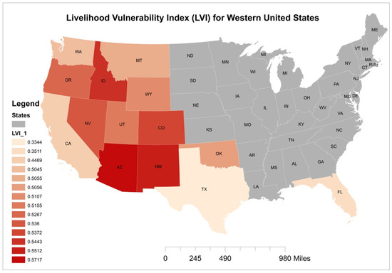 Subsequently, we calculate the LVI and the corresponding contributing factors for each of the analyzed states based on our developed framework (Table A2). Our methods for computing the LVI follows a similar approach to [18,27]. Before the computation, we need to interpret whether the magnitude of each indicator value, under each contributing factor, is influencing the contributing factor positively or negatively. If the indicator variable is affecting the contributing factor negatively, then the inverse value is taken.