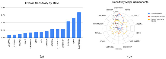 Histogram showing the overall sensitivity of the 14 selected states in the US with California having the highest sensitivity (with respect to wildland fire) and Texas having the lowest overall sensitivity (a). Radar plot showing the different major components of the sensitivity contributing factor, namely, demographic (blue), ignition causes (red), and the environmental index (yellow) for the selected 14 states of the US used in this study (b).