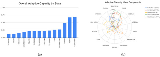 Histogram showing the overall adaptive capacity of the 14 selected states in the US with California having the highest adaptive capacity (with respect to wildland fire) and Texas having the lowest overall adaptive capacity (a). Radar plot showing the different major components of the adaptive capacity contributing factor, namely, natural capital (blue), physical capital (red), human capital (yellow), social network (green), and the financial capital (orange) for the selected 14 states of the US (b).
